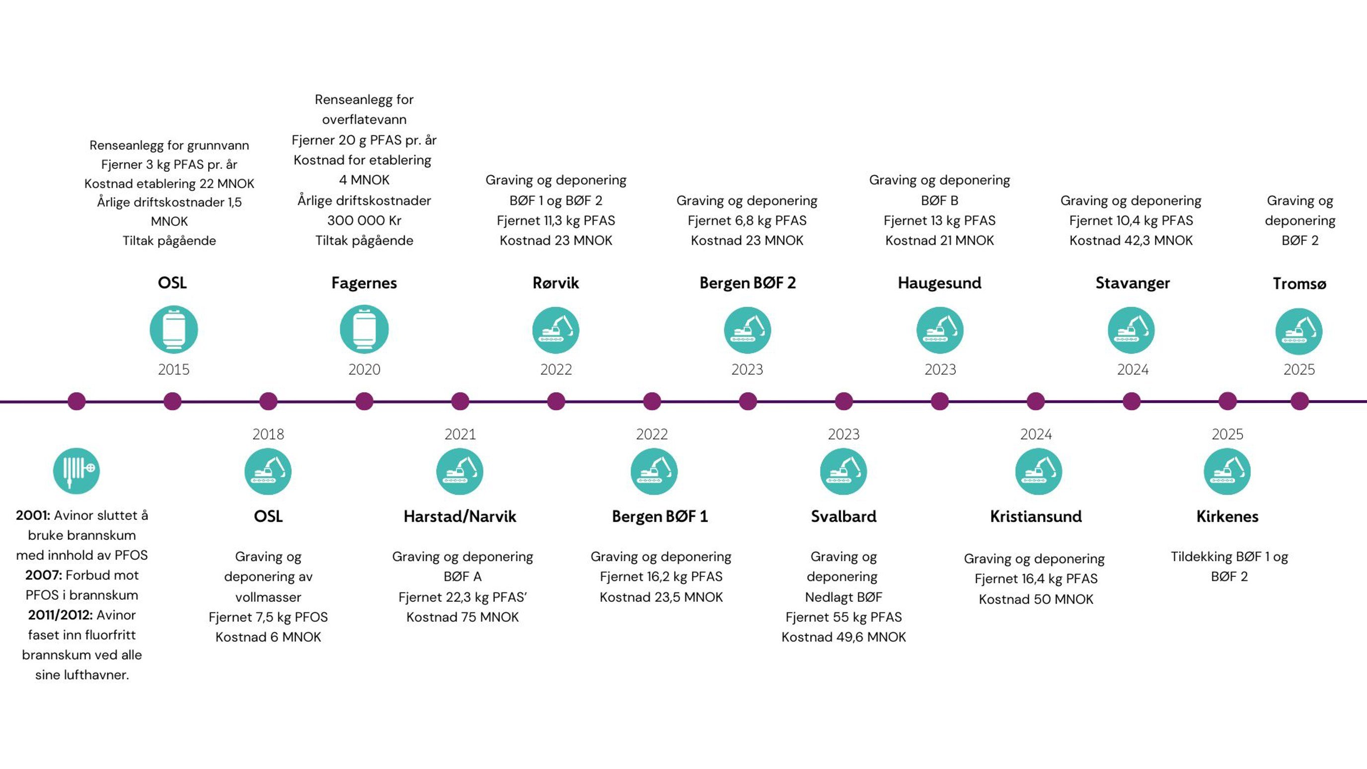 Avinor har etablert et eget PFAS-program som har ansvar for kartlegging, utarbeidelse av tiltaksplaner og opprydninger etter pålegg fra Miljødirektoratet. Til grunn for programmets arbeid ligger at de samlede utslippene av PFAS fra Avinors lufthavner skal reduseres så langt det lar seg gjøre (jamfør krav i pålegg fra Miljødirektoratet). Målsetningen er å fjerne PFAS, eller redusere spredning, fra de mest forurensede områdene ved 13 prioriterte lufthavner innen 2027. Prioriteringen baserer seg på samlerapporten fra 2019 som ble utarbeidet etter pålegg fra Miljødirektoratet. Figuren under viser tiltak som frem til nå er gjennomført ved Avinor sine lokaliteter (Figur 1).
