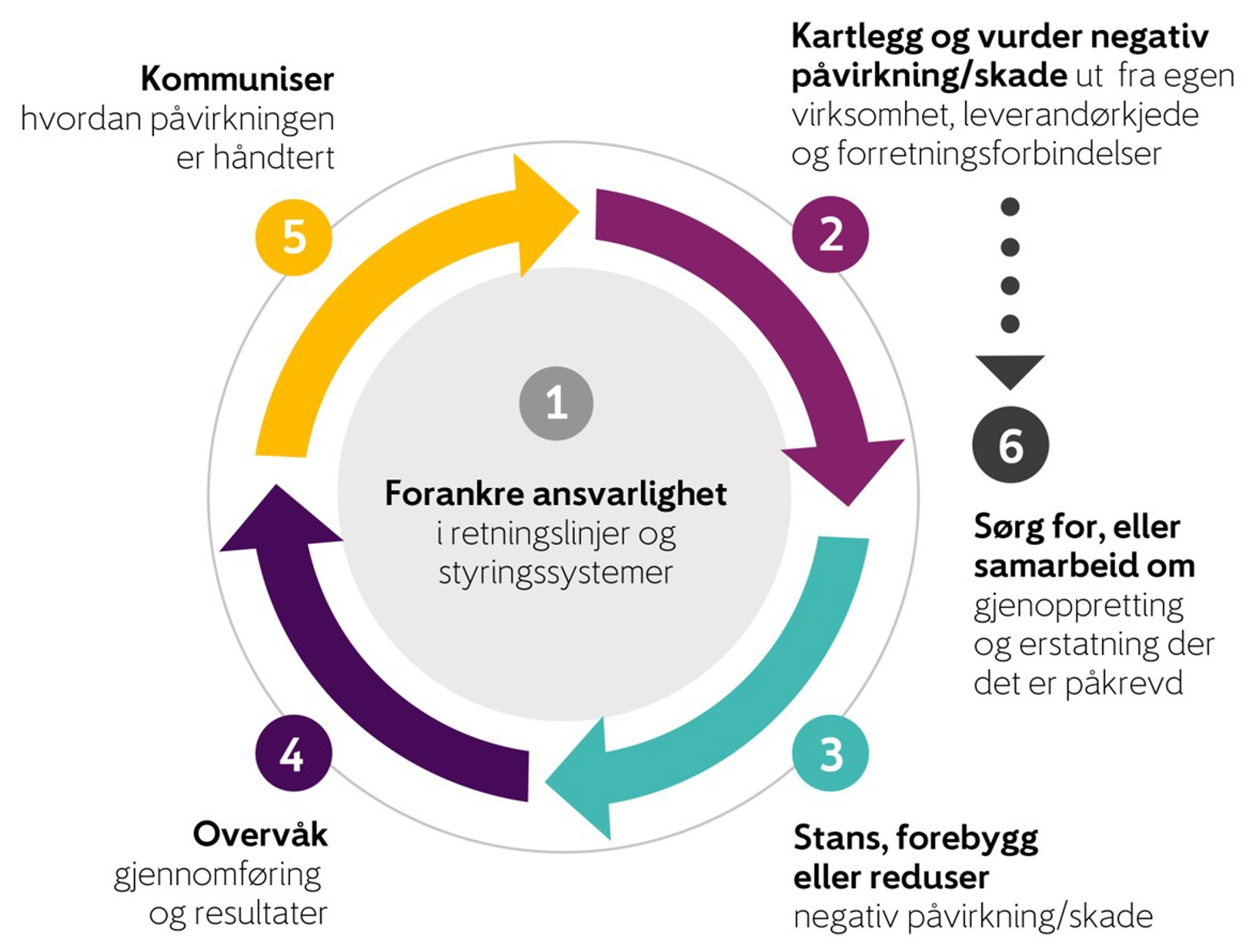 Avinor gjennomfører aktsomhetsvurderinger i tråd med OECDs retningslinjer for ansvarlig næringsliv for å identifisere, redusere og forhindre brudd på menneskerettigheter og arbeidsvilkår. Metodikken i aktsomhetshjulet er implementert i Avinors styringssystem gjennom policyer, retningslinjer og prosedyrebeskrivelser. Aktsomhetshjulet er integrert i gjennomføring av risikovurderinger. Avinor har en risikobasert tilnærming til aktsomhetsvurderinger og prioriterer de områdene vi finner den alvorligste risikoen kombinert med vår påvirkningsmulighet. For egen virksomhet betyr det at vi prioriterer de forholdene som i størst grad potensielt kan påvirke egne ansatte negativt, eller påvirkning gjennom Avinors virke som skader samfunn, mennesker, klima og miljø negativt.